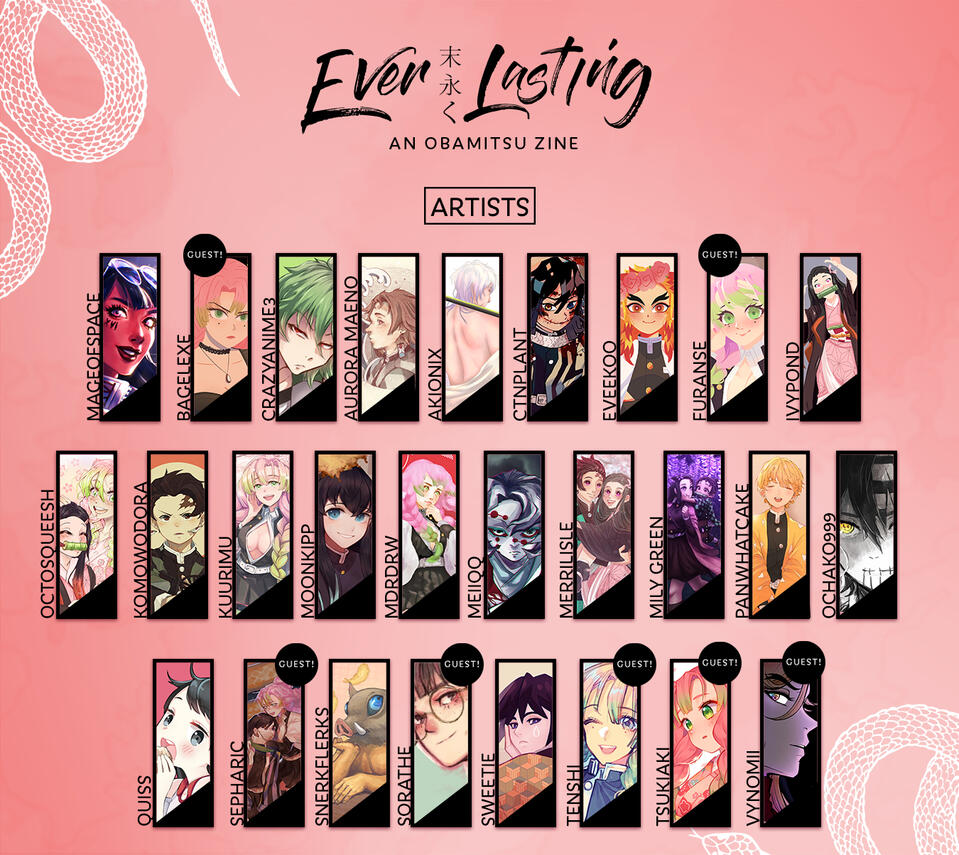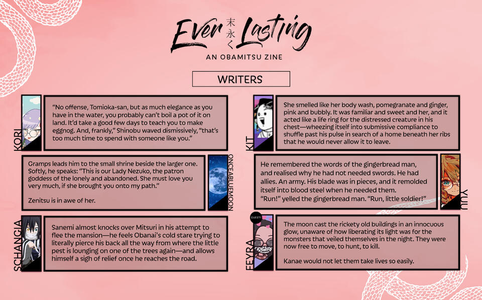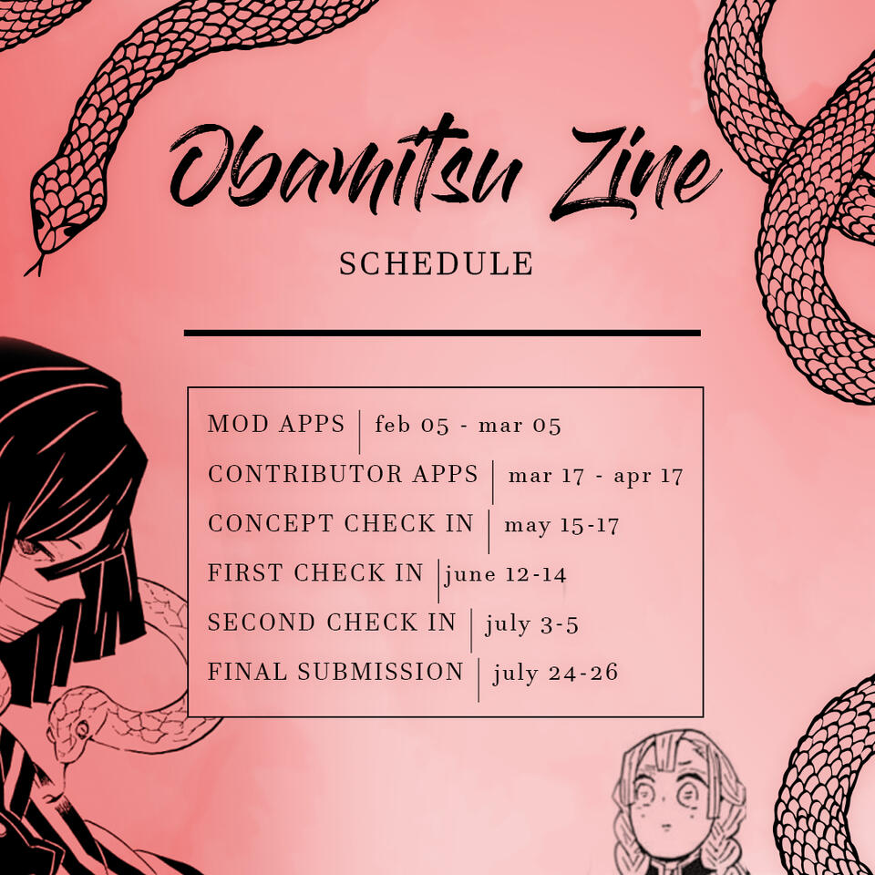 From the creators of KNY Mystic Zine, we bring to you an upcoming, SFW & For-Profit KNY fanzine centered around the ship Obamitsu (Mitsuri and Obanai). Zine will be offered both physically and digitally, as well as with merch.